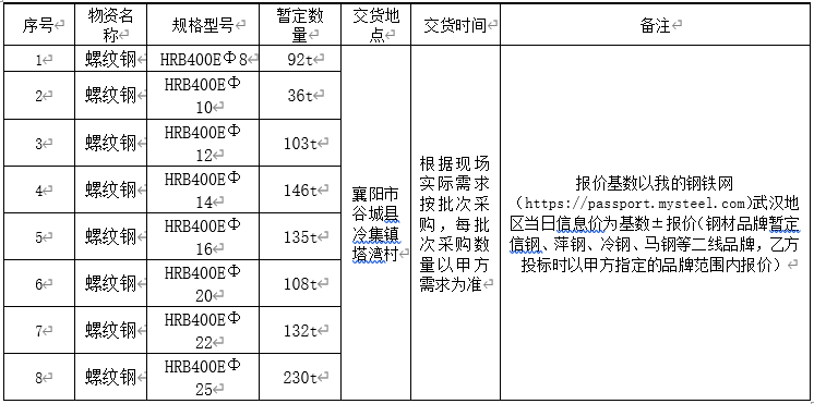 ②報價基數以我的鋼鐵網(https://passport.mysteel.com)武漢地區當日信息價為基數±報價(鋼材品牌暫定信鋼、萍鋼、冷鋼、馬鋼等二線品牌,乙方投標時以甲方指定的品牌范圍內報價)。
