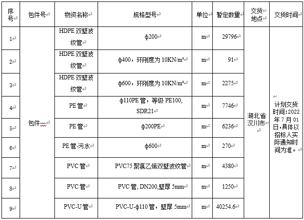 1.2 招標(biāo)內(nèi)容:本次管材采購招標(biāo)內(nèi)容詳見下表。
